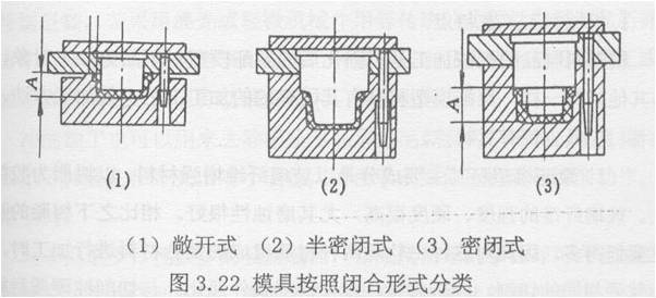 ③半密閉式模具如圖3.22(3)所示。該種模具型腔上有加料室,型腔內(nèi)有擠出環(huán),制品的密實性比敞開式模具成型的制品好,且易于保證高度方向尺寸精度,脫模時可以避免擦傷制品。